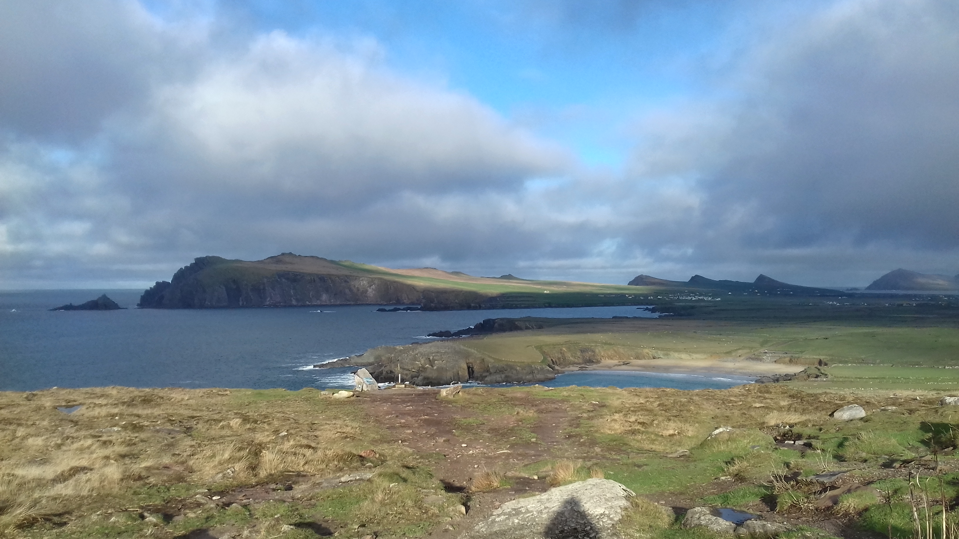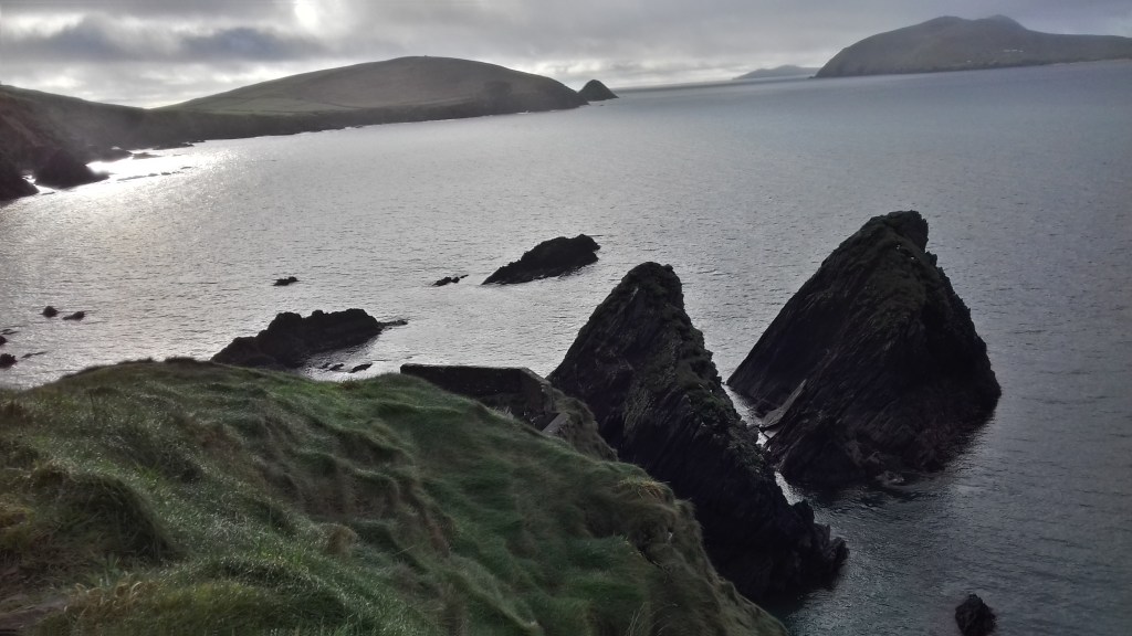 Je parie sur ma chance dès demain pourtant, je bicycle la route panoramique de Slea Head dans le soleil et en rond sur moi-même. Je contemple alors l’océan, les roches érodées, les montagnes joueuses, je compte les quarante nuances de vert de l’Irlande, laisse libre court à ma pensée. C’est fou à quel point le brouillard, qu’il soit intérieur ou sur la Terre, peut dérober ce qui était en fait à portée de pieds, à hauteur du regard. Je repasse à vélo par tous les endroits traversés à la marche et j’aurais pu être dans un tout autre endroit que ça ne m’aurait pas surprise.