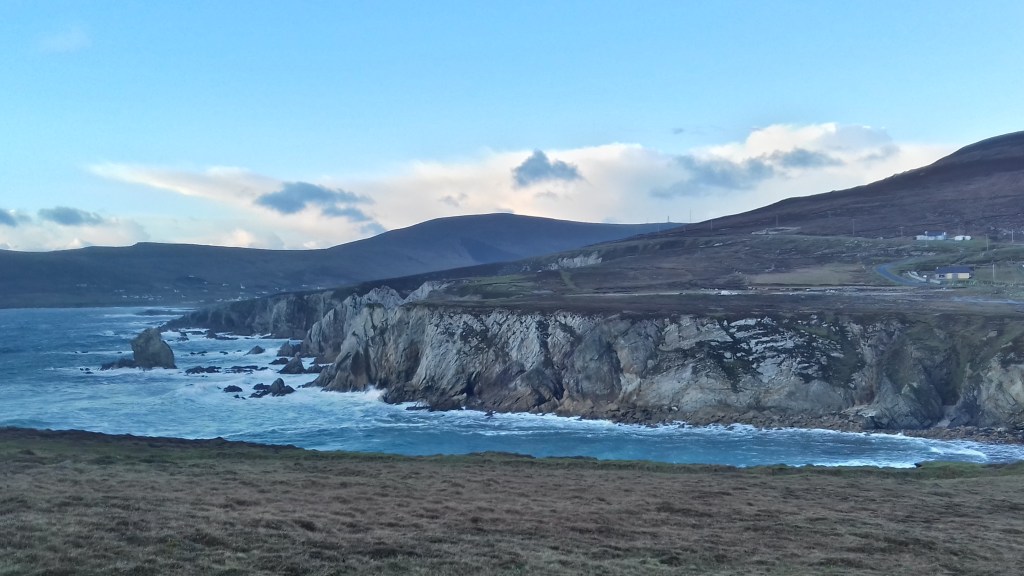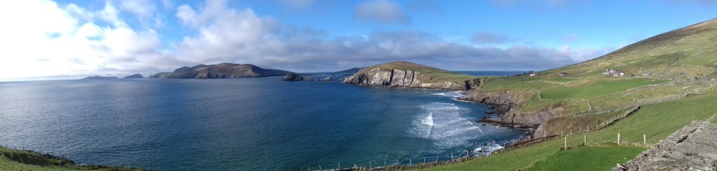 Soudain, je ne suis plus seule au monde, toute l’Irlande, tous les océans de la Terre, sont là pour me tenir compagnie, pour raconter des chansons à mon oreille curieuse et protéger mes errances. J’aperçois enfin le Ring of Kerry de l’autre côté, les Blasket Islands percées de soleil et de pluie fluorescente. Je roule le vent dans les cheveux, le sel de la mer dans la bouche, le souffle coupé à chaque nouveau coteau. Mes yeux sont pleins des trésors luminescents de la Péninsule dont je ne peux presque rien écrire à part que c’est beau à en pleurer, à en fou rire. A chaque fois que je pense avoir atteint l’apogée de ce petit nez de terre, le paysage suivant vient à me contredire par son immensité verte et houleuse, par sa magnificence grandiose. Le brouillard était là hier, frustrant et pourtant beau, afin de m’obliger à revenir plus loin, plus près. Pour mieux apprécier ce que j’ai failli manquer.