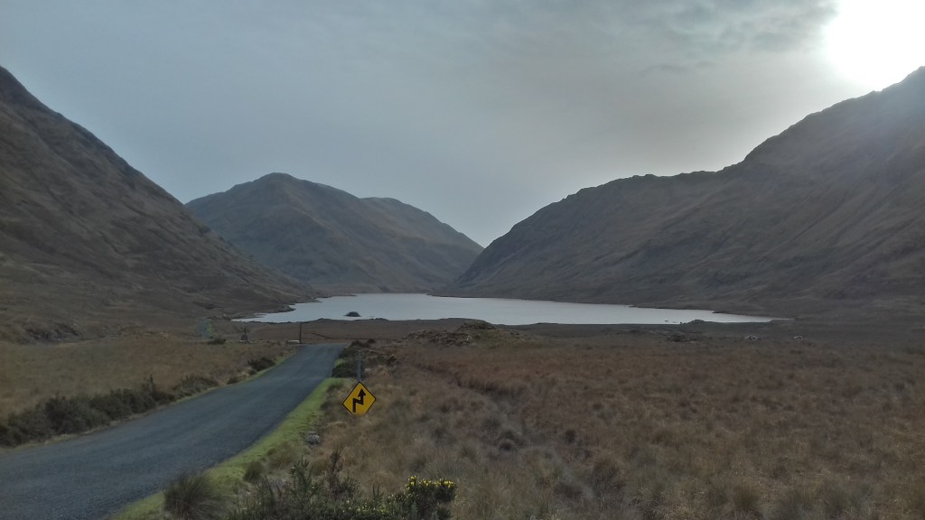Nous longeons les côtes du Kerry embrumé en partageant les histoires de nos vies parallèles. Nous prenons le Parc National à revers et j’admire enfin toutes les vallées noires et jaunes, tous les monts qui creusent des lacs aux entrailles de la Terre. Les montagnes se révèlent les unes après les autres, mauves de l’hiver, au bord de l’Atlantique aveugle. Je profite même de la vue accordée aux dames de compagnie de la Reine Victoria, sur l’autre versant de Dunloe.