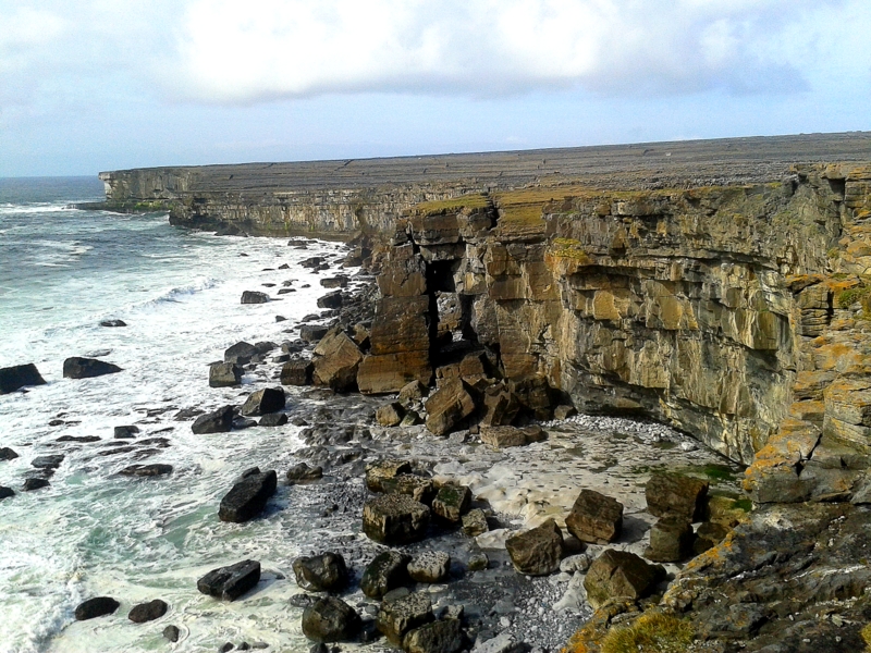 Et je passe mon après-midi à me perdre dans trente et un kilomètres carré. Je cherche en vain la porte d’entrée des fées mais elles m’ont abandonnée. Je cherche une porte de l’Autre Monde bien particulière, celle que la croyance populaire a transformée en couche nuptiale de Diarmuid et Grainne dans leur course éperdue et mythique. Grainne, jeune femme promise à Fionn Mac Cumhal, le chef déjà vieux de la bande de guerriers des Fianna, tombe follement amoureuse de Diarmuid l’un des dits guerriers, le plus beau d’entre eux cela va s’en dire. Pour sa défense, Diarmuid possède une tâche d’amour enchantée qui ensorcelle d’amour toute femme qui le voit. Malgré le sens aigu de l’honneur qui le pousse à résister à la jeune fille amoureuse, Grainne fait appel à une très vieille magie irlandaise : le pouvoir du geis, qui a valeur de défi ou d’interdit selon le contexte. Transgresser un geis est un péril plus mortel que le déshonneur qui attend Diarmuid en trahissant son chef, ainsi ils s’enfuient tous deux, inextricablement liés par le destin et la magie. Poursuivis par Fionn et sa vengeance pendant sept ans, ils parcourent l’Irlande sans jamais rester plus d’un jour au même endroit, fabriquant à chaque fois un lit de fortune à l’abri d’un dolmen. Les amants maudits auraient ainsi fait halte à Inis Mor mais je ne peux le voir de mes propres yeux puisque je m’égare.
